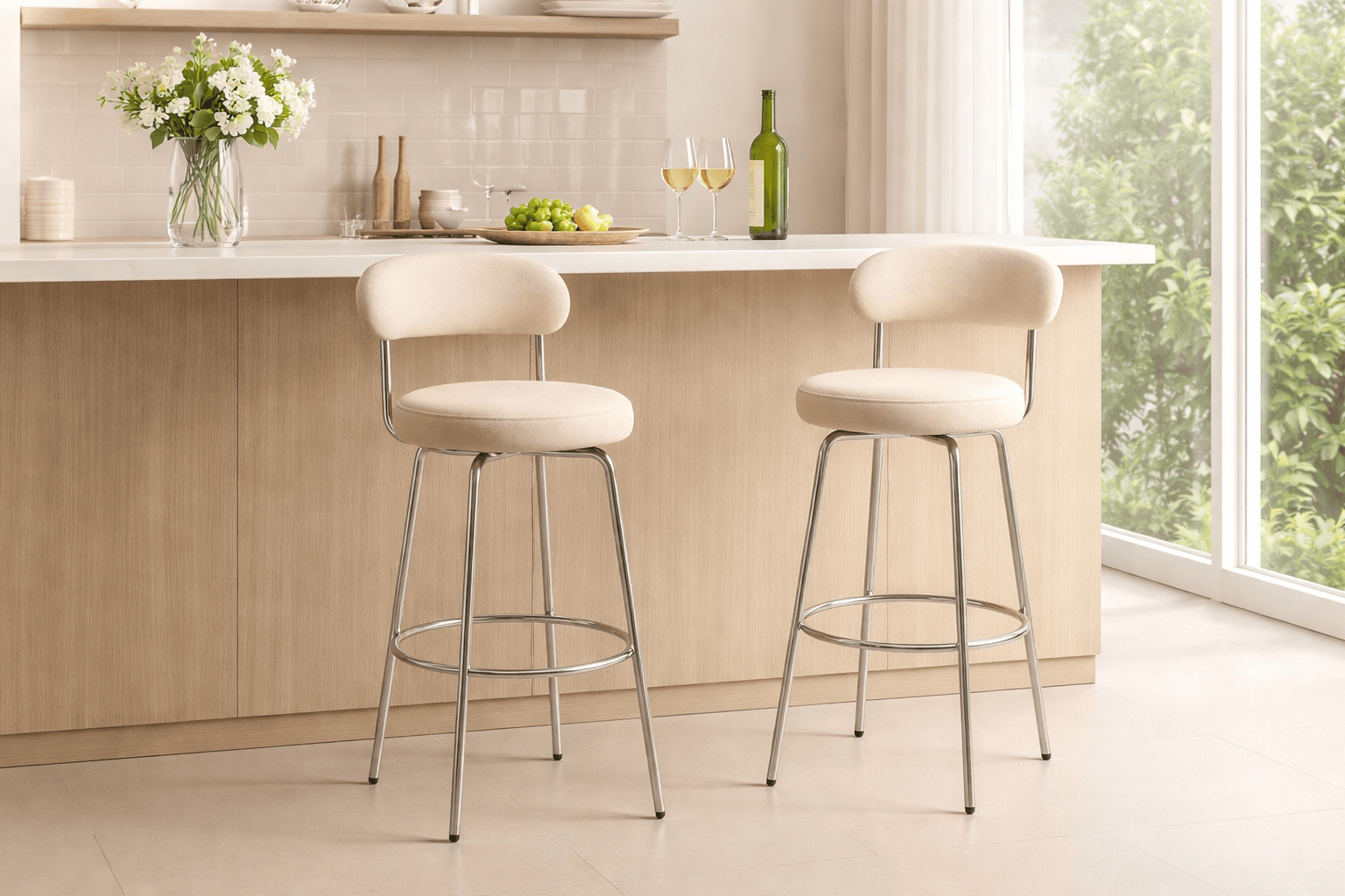 Beige polyester fabric upholstered bar stool with a chrome frame and integrated footrest. Designed for everyday seating with a clean, modern look and stable support. Total height: 105 cm.